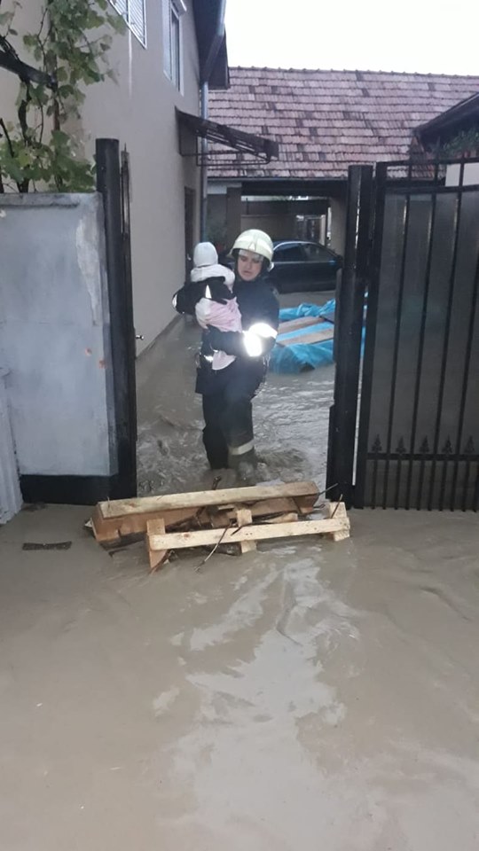 La Dumitra a fost un adevărat prăpăd : apa de pe Dealul Târgului a coborât în torent către vatra satului surprinzând oamenii în case. Pompierii din Năsăud au evacuat dintr-o casă o mamă cu un copil (foto) dar și o femeie de 60 din alta. Drumul județean DJ 15 a fost inundat de aluviuni.