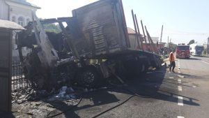 Două autospeciale ale pompierilor au intervenit în jurul orelor 13,00 pentru a stinge incendiul, care se generalizase la întregul cap de tir. Potrivit primelor informații ale ISU cabina tirului, care nu era încărcat, a ars aproape complet. Șoferul tirului s-a salvat la timp și nu a avut nevoie de intervenția paramedicilor. Tirul din care ieșea un fum innecăcios a ajuns într-un șanț în fața unei case din Mijlocenii Bârgăului, acolo unde pompierii au și lichidat incendiul.