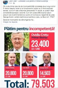 Președintele USR Bistrița, Călin Stan face un inventar într-o postare pe facebook a banilor cu care pleacă acasă lună de lună cei patru conducători ai municipalității, adică primarul Ovidiu Crețu, cei doi vice, Cristian Niculae și Gelu Muthi precum și administratorul public, George Avram și pune aceste sume în balanță cu prestațiile fiecăruia.