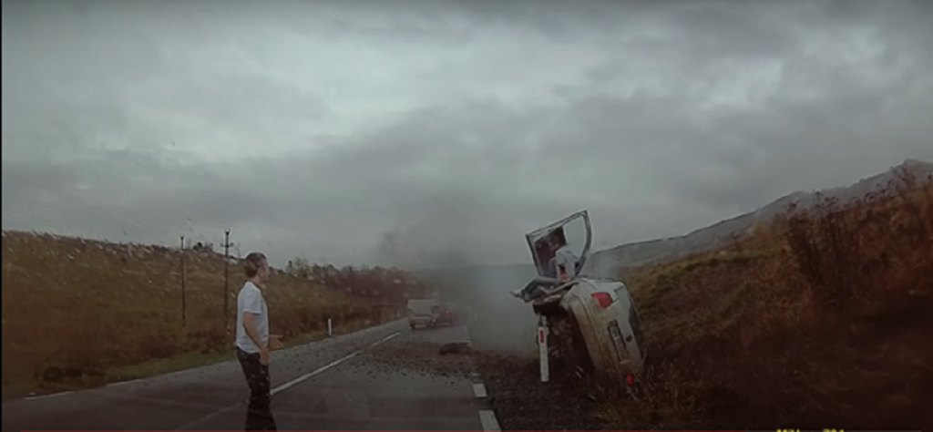 În filmulețul de 1 minut și 15 secunde se poate vedea cum un șofer extrem de imprudent intră cu viteză, în depășire, pe linie continuă pe un drum de țară, în timp ce din față vine un alt autoturism: mașina imprudentului reușește să treacă milimetric, însă intră în derapaj puternic pe carosabilul umed și este aruncată în șanț după ce patinează o bucată pe aripă. Mașina scoate un fum negru și dens când reușește să se oprească, iar șoferul iese aparent nevătămat din mașina înfiptă în șant. Șoferul a cărui cameră de bord a înregistrat totul poate fi văzut ieșind sa verifice dacă poate ajuta, însă celălalt șofer care a reusit să părăsească mașina avariată îi face semn ca e în regulă: