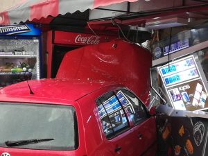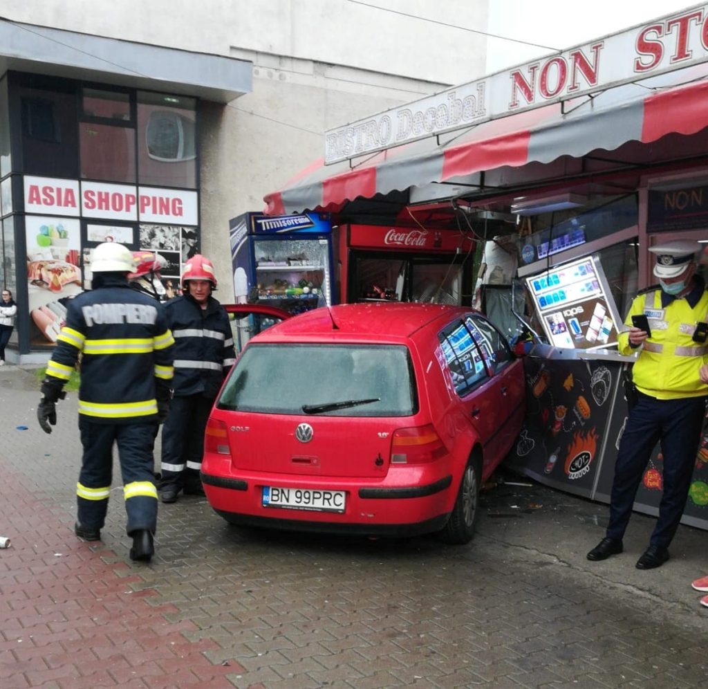 Un bistrițean de 50 de ani a plonjat cu mașina pe trotuar sâmbătă seara în mijlocul Bulevardului Decebal și s-a înfipt în chioșcul tip fast food de lângă Magazinul Caraiman. Înainte de a intra cu mașina în chioșc autovehiculul său  a lovit o altă mașină aflată în parcare.