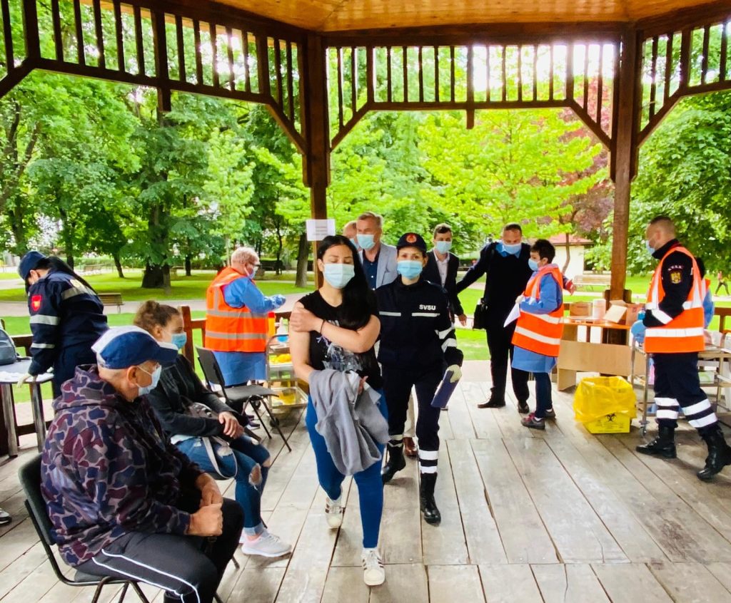 Centrul din Parcul Municipal este deservit de echipele SVSU Bistrița, aceleași care au vaccinat tot weekendul în fața Bisericii Evanghelice. De data asta au schimbat serul Johnson & Johnson cu Pfizer, singurul aprobat de autoritățile medicale pentru tinerii sub 18 ani.