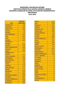 | Nr.crt. | JUDEȚ | LOCALITATE | POPULAȚIE | CAZURI | INCIDENȚA |