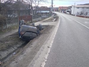 Un tânăr de 18 ani din Teaca a ajuns cu mașina pe care o conducea, răsturnată cu roțile în sus  într-un șanț, după ce a pierdut controlul volanului și s-a izbit de un stâlp de electricitate, din care a ricoșat.
