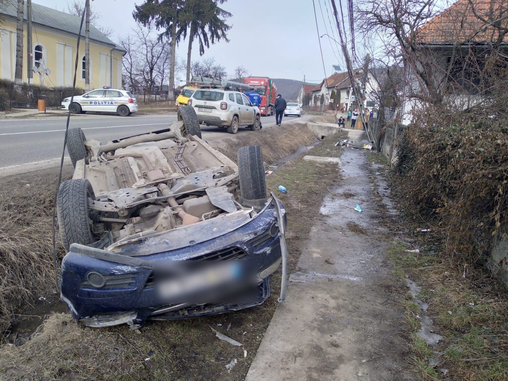 Un tânăr de 18 ani din Teaca a ajuns cu mașina pe care o conducea, răsturnată cu roțile în sus  într-un șanț, după ce a pierdut controlul volanului și s-a izbit de un stâlp de electricitate, din care a ricoșat.