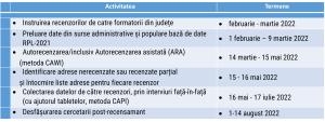 Datele obținute in recensământul online si care vizează domiciliul stabil cel puțin din ultimele 12 luni și nu pe cel flotant urmează să fie coroborat cu informațiile obținute de la MAI, alte surse administrative, Ministerul Invatamantului, Casa de Pensii. Dacă februarie si martie vor fi luni în care se preiau incă informațiile din sursele administrative locale, urmează din 14 martie până în 14 mai recenzarea, inclusiv cea asistata, timp 2 luni de zile. Vor urma 2 luni, între 17 mai-17 iulie cu o alta etapă de recenzare in teren fata in fata , după care ancheta post-recensământ pentru validarea datelor.