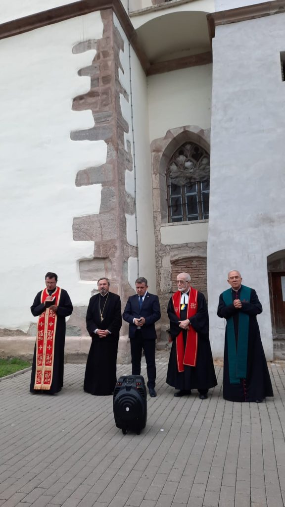 Părintele Protopop Ortodox Alexandru Vidican, prezent și sâmbătă, asa cum a făcut-o de 14 ani încoace la rugăciunea ecumenică din fața Bisericii Evanghelice, a spus: ”grecii au o vorbă: panta rhei, adica totul curge, Si noi constatăm că parcă timpul curge prea repede (…) . iată 14 ani de când ne întâlnim în fiecare an, pentru a comemora aici. . Cand Mântuitorul le spune celor 12 apostoli că va fi răstignit, apostolii s-au intristat. Insa IIsus le-a spus ” intristarea voastră se va transforma în bucurie. Iată că intristarea de acum 14 ani și acum întristarea noastra s-a transformat în bucurie văzând aceasta mireasa a lui Dumnezeu, aceasta biserică tot mai frumoasa . Noi cu toți bistrițenii ne bucurăm” le-a spus celor prezenți părintele protopop Alexandru Vidican.