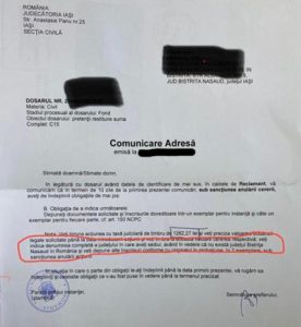 Pe urmele adresei buclucașe, Bistrița Express a aflat că documentul are parafa unei judecatoare din Iași și a fost transmis în urma cu trei ani la o firma de avocatura din Bistrița care reprezenta o societate comercială aflată în litigiu cu o alta din Iași de la care avea de recuperat bani.