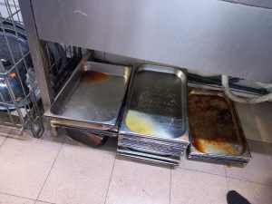 – folosirea unor materii prime fără elemente de identificare, produse care nu aveau inscripționate data și ora pregătirii, precum și data și ora desigilării, motiv pentru care nu se poate efectua trasabilitatea acestora; – utilizarea unor cuptoare neigienizate, cu urme grosiere de arsuri; – folosirea unor friteuze cu un grad ridicat de uzură, precum și cu depuneri de arsuri; – depozitarea casoletelor utilizate la livrarea preparatelor culinare către consumatori în același spațiu cu lavete neigienizate și cu materii prime desigilate; – folosirea unor recipiente de gătire cu un grad ridicat de uzură, cu urme de rugină, acestea fiind depozitate pe paviment, atât cele utilizate, cât și cele neutilizate” a precizat comunicatul CJPC.