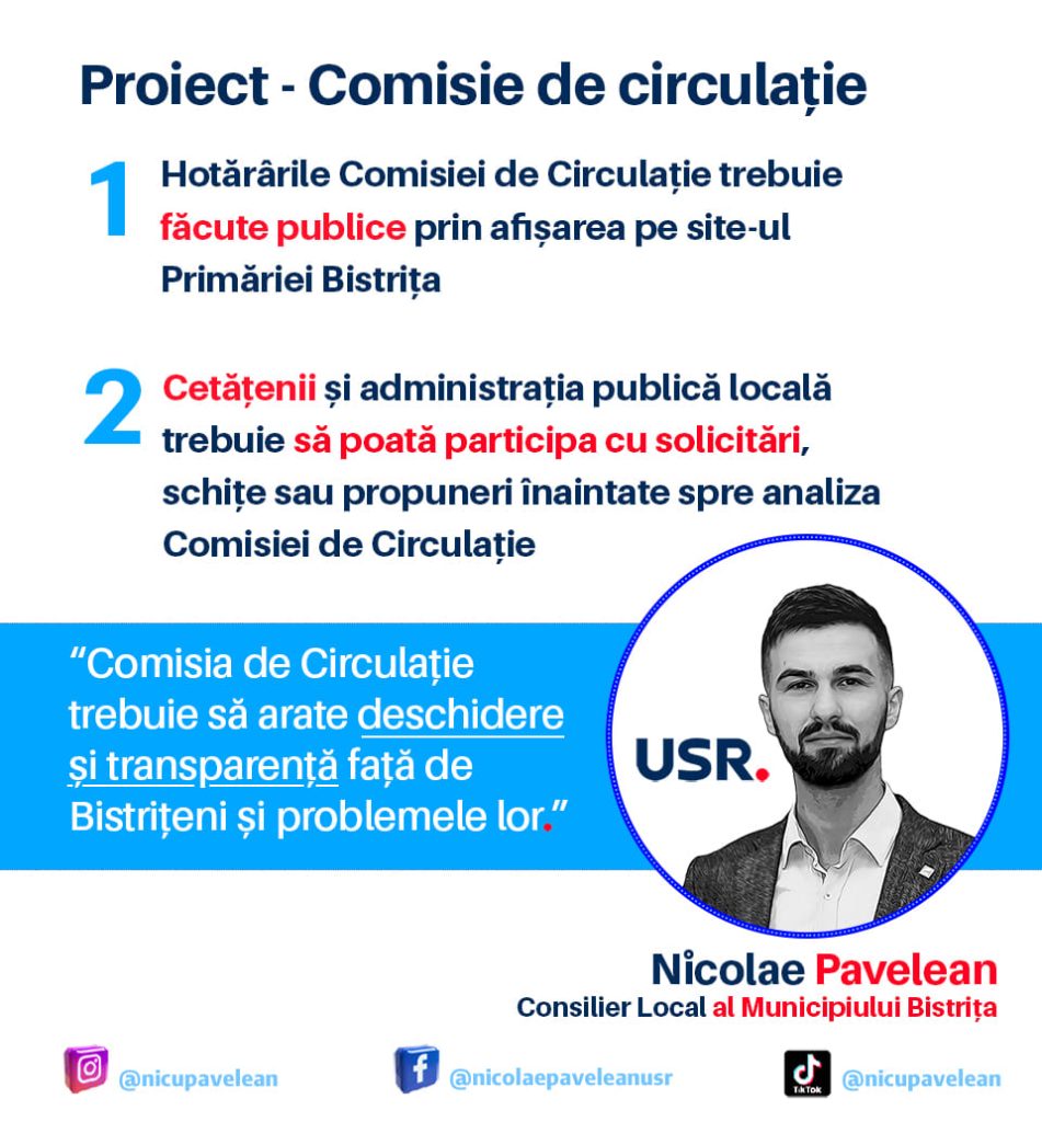 Municipalitatea își înființează comisie de circulație. Un consilier USR cere ca hotarârile comisiei sa fie publicate, iar bistrițenii sa poate face propuneri