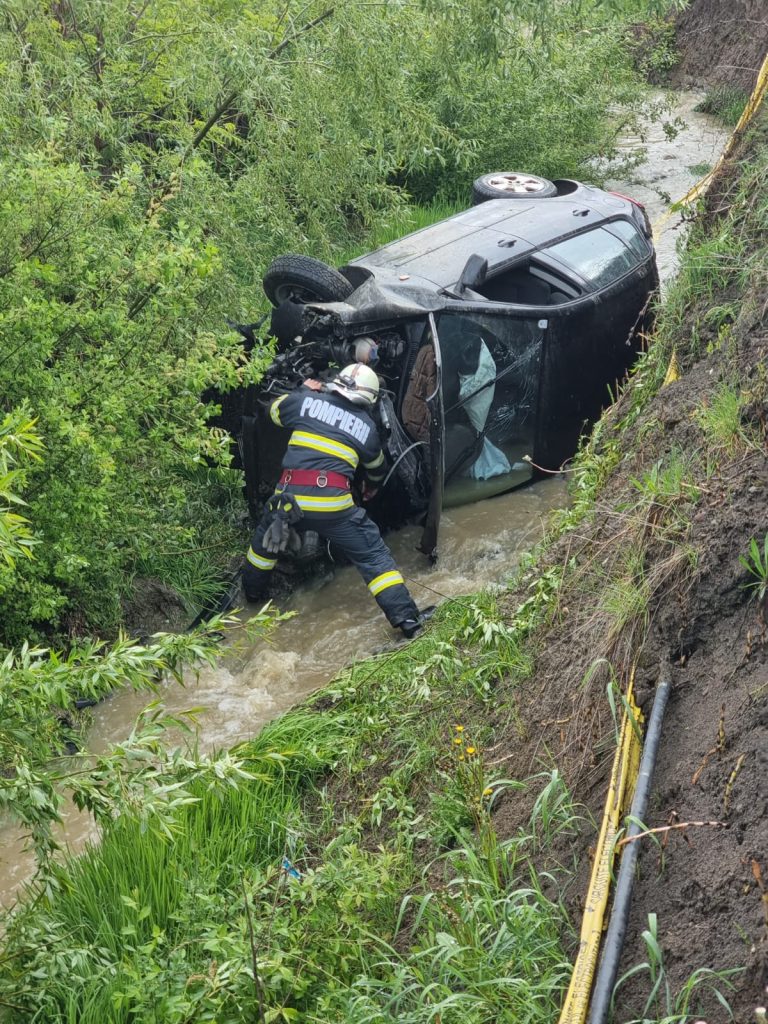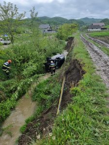O șoferiță de 40 de ani a pierdut controlul mașinii pe un drum alunecos de pământ din Dumitra, din apropierea unui mal abrupt iar autovehicolul a plonjat cu roțile în sus în pârăul șanțului.