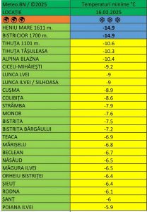 Cea mai scăzută temperatură din județul Bistrița-Năsăud înregistrată duminică, 16 februarie a fost de minus 15 grade, măsurate de două stații meteo private din zona montană la altitudinea de 1500-1600 metri.