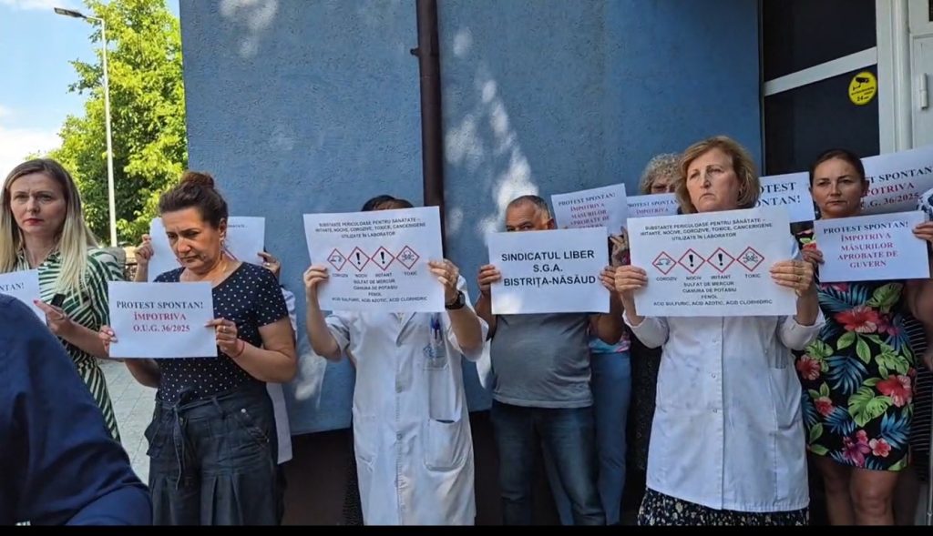 Un protest spontan declanșat luni dimineață de Sindicatul Liber Apele Române i-a scos afară din instituție și pe angajații SGA Bistrița. Timp de câteva minute angajații au afișat pancarte și și-au spus nemulțumirile în fața jurnaliștilor.