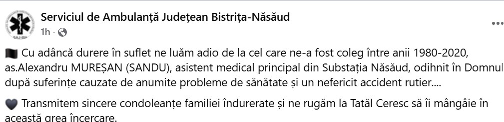 Serviciul Județean de Ambulanță Bistrița-Năsăud a anunțat astăzi într-un mesaj de condoleanțe pe facebook că fostul lor coleg, Alexandru Mureșan, fost asistent principal al Stației Năsăud, a decedat