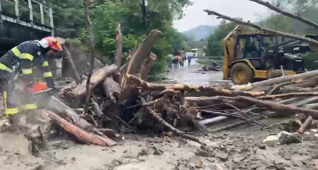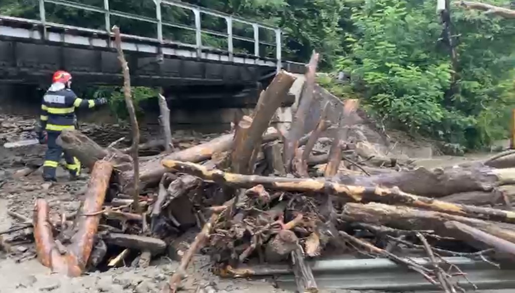 Pompierii si formațiunile de voluntari pentru situații de urgență degajeaza carosabilul de copaci, a informat ISU