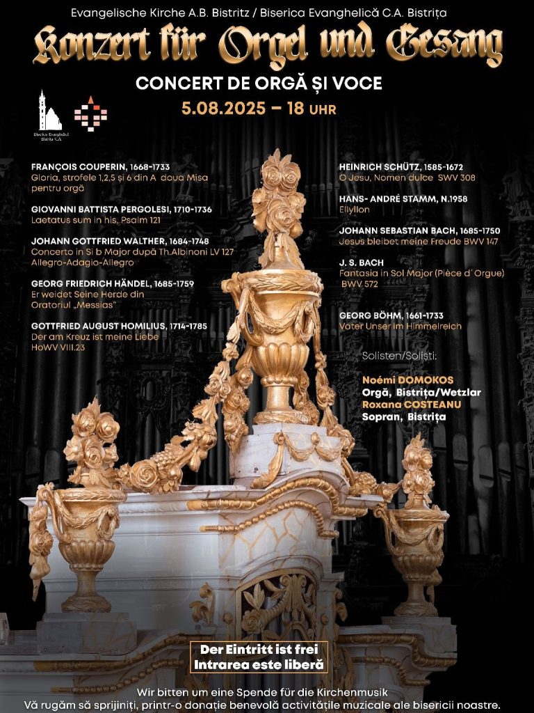 Biserica Evanghelică din Bistrița găzduiește marți, 5 august un eveniment muzical de excepție, un concert de orgă și voce care îmbină armonii solemne și emoție autentică într-un cadru de o frumusețe aparte.