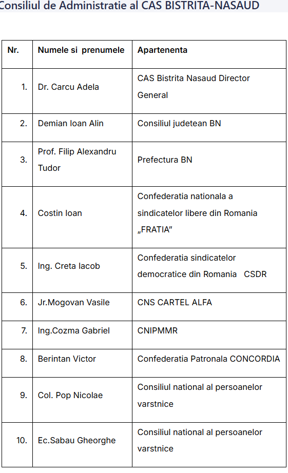 Casa Județeană a Asigurărilor de Sănătate (CJAS) Bistrița-Năsăud are pe statul de plată pe lângă proprii angajați și membri unui consiliu de administrație, 10 cu totul, din care fac parte, din 2022 oameni care n-au nicio treabă cu sănătatea ori finanțarea acesteia: sunt lideri de sindicat, reprezentanți ai patronatului, ai asociaților de vârstnici, și a două instituții de nivel județean: Prefectura si Consiliul Județean. Nu e clar cum au ajuns unele patronate si sindicate sa fie reprezentate și altele nu, cert este că au mandate pentru 4 ani. Însă sunt acolo, pentru că așa a prevăzut legea că ar trebui sa arate un CA al instituției care gestionează bugetul public de sanatate.