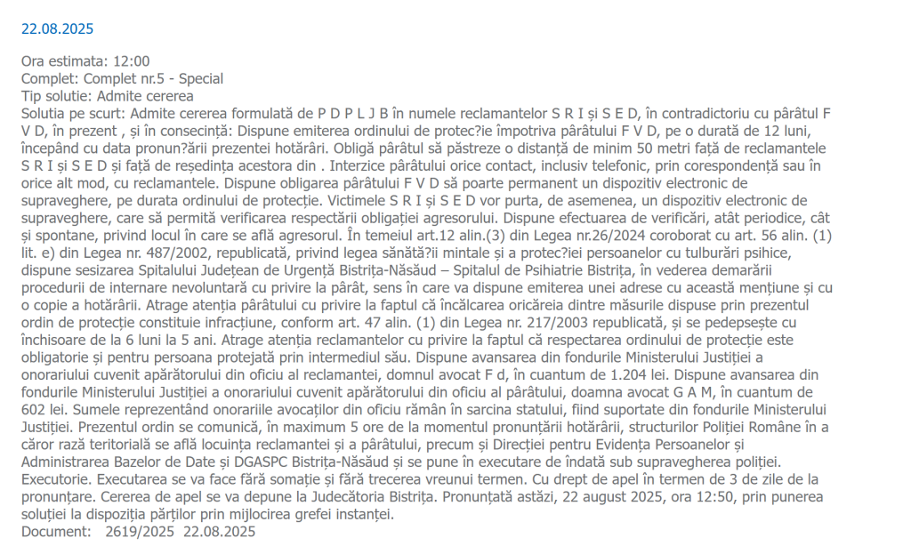 În plus instanța le-a cerut polițiștilor sa facă verificari periodice, dar și ”spontane” a locului în care se află agresorul și sa asigure ca situația este sub control. Judecatorii au cerut suplimentar, invocand legea sănătății mintale sesizarea Spitalului de Psihiatrie pentru procedura de internare nevoluntara a acestuia, probabil pentru o perioda mai lungă decât, în condițiile în care acesta este internat deja în Spital , de unde a si fugit o deja pentru aproape o zi întreagă: ”Dispune efectuarea de verificări, atât periodice, cât şi spontane, privind locul în care se află agresorul. În temeiul art.12 alin.(3) din Legea nr.26/2024 coroborat cu art. 56 alin. (1) lit. e) din Legea nr. 487/2002, republicată, privind legea sănătății mintale şi a protec?iei persoanelor cu tulburări psihice, dispune sesizarea Spitalului Judeţean de Urgenţă Bistriţa-Năsăud – Spitalul de Psihiatrie Bistriţa, în vederea demarării procedurii de internare nevoluntară cu privire la pârât, sens în care va dispune emiterea unei adrese cu această menţiune şi cu o copie a hotărârii. Atrage atenţia pârâtului cu privire la faptul că încălcarea oricăreia dintre măsurile dispuse prin prezentul ordin de protecţie constituie infracţiune, conform art. 47 alin. (1) din Legea nr. 217/2003 republicată, şi se pedepseşte cu închisoare de la 6 luni la 5 ani.”
