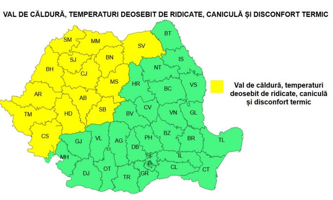 Pentru vineri, 5 septembrie; ANMH anunță intensificarea valului de căldură, temperaturi deosebit de ridicate. Indicele temperatură-umezeală (ITU) va atinge pe alocuri pragul critic de 80 de unități și va fi disconfort termic. Temperaturile maxime vor fi cuprinse între 30 și 36 de grade.