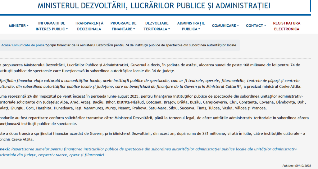 Din Bistrița-Năsăud doar Centrul Cultural Municipal George Coșbuc este pe lista alocarilor. ”Suma reprezintă 2% din impozitul pe venit încasat în perioada iunie-august 2025, pentru finanțarea instituțiilor publice de spectacole din subordinea unităților administrativ-teritoriale solicitante din județele” a precizat Ministerul Dezvoltării într-un comunicat de presă.