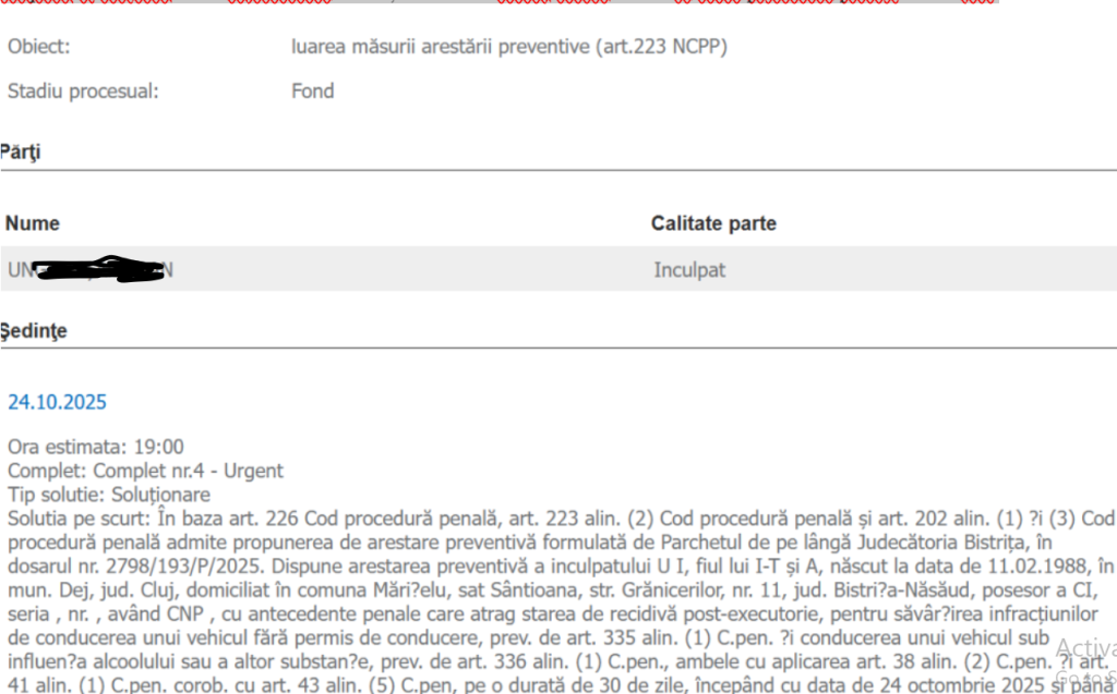 Reținut de polițiști în noaptea urmăririi, individul, care era si recidivist post condamnare a ajuns în fața judecatorilor de drepturi si libertati de la Judecatoria Bistrița, care l-au trimis vineri direct în arest preventiv pentru 30 de zile, potrivit datelor portalului instantelor consultate de BistrițaExpress.