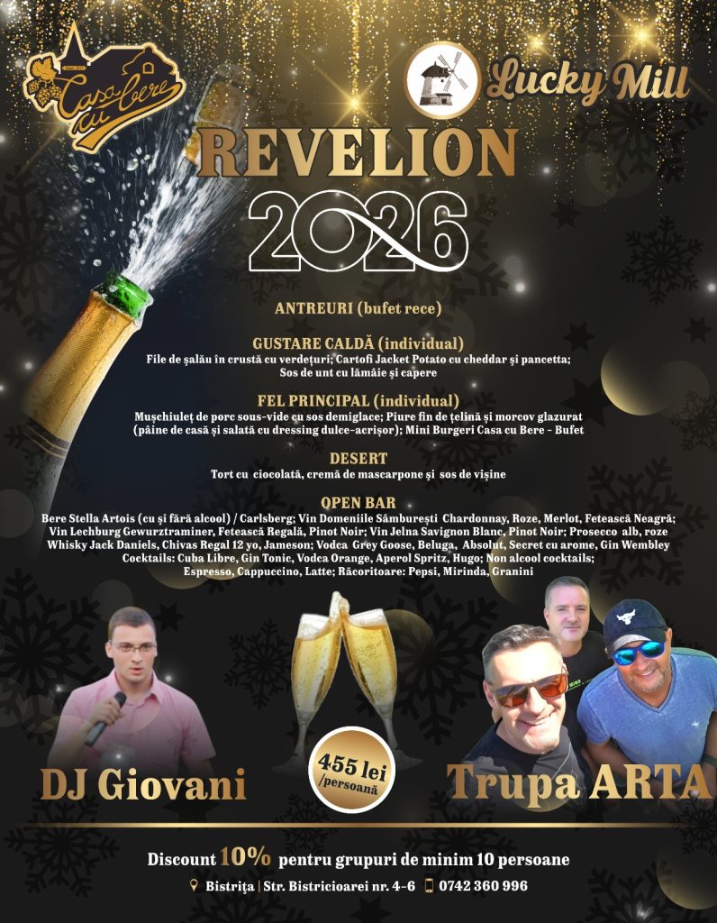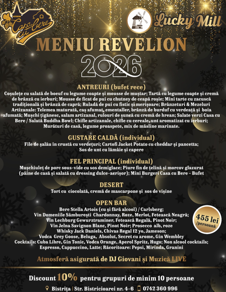 Casa cu Bere și Lucky Mill se pregătesc să întâmpine intrarea în Noul An, 2026 cu o seară de neuitat, plină de muzică, voie bună delicii culinare rafinate, plus o selecție de băuturi în Open Bar.