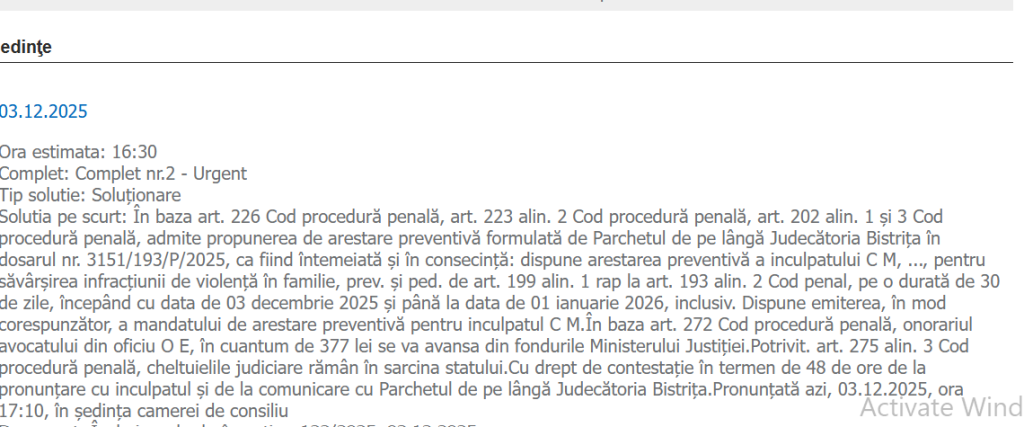 Agresorul a ajuns în aceasta după amiază în fața procurorilor iar jurul orelor 16, 30 a ajuns în fața magistratului de drepturi si libertăți a Judecatoriei Bistrița care la ora 17,15 s-a pronunțat si a decis în favoarea celei mai dure măsuri preventive, arestul pentru 30 de zile: