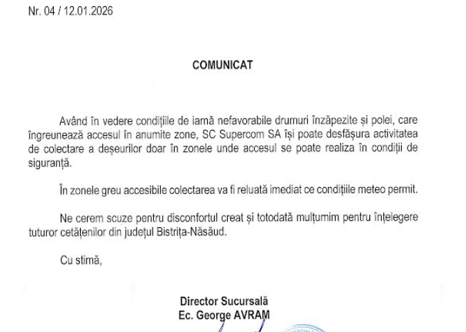 Potrivit unui comunicat transmis în 12 ianuarie, semnat de directorul județean George Avram, colectarea în aceste zone va fi reluată din momentul în care condițiile meteo o vor permite: