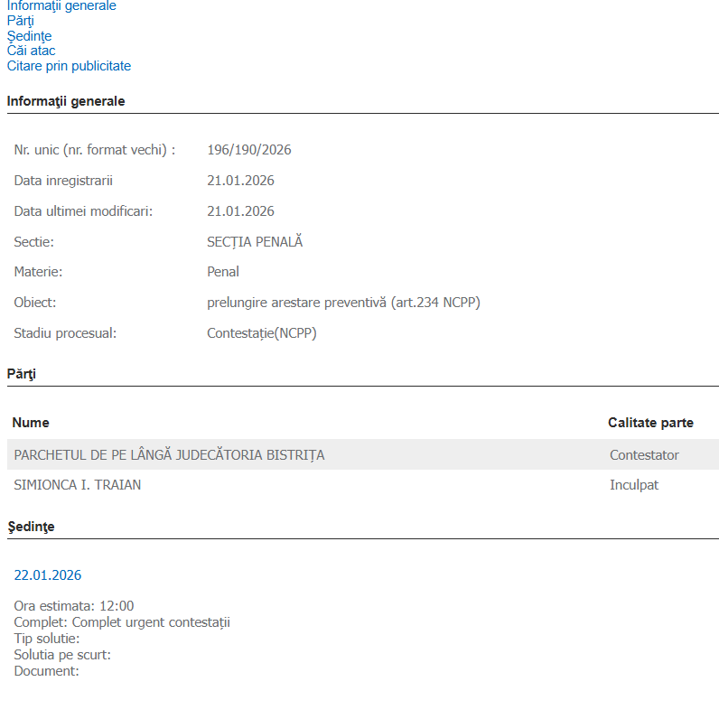 Joi după amiază un complet al Tribunalului Bistrița-Năsăud analizează contestația procurorului de caz de la Judecatoria Bistrița la hotararea magistraților Judecatoriei care au decis să nu acorde prelungirea arestului preventiv pentru Simionca după expirarea în 23 ianuarie a primului mandat care l-a trimis după gratii si să-l plaseze în arest la domiciliul lui din Livezile.