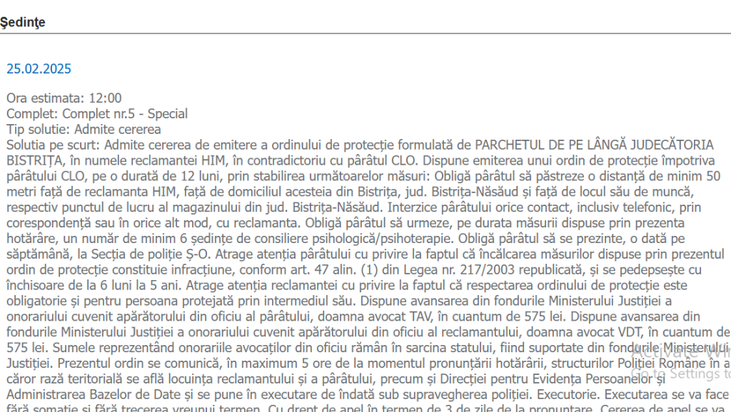 Bărbatul, Luca Ovidiu C. a fost condamnat în 2021 pentru furt calificat (faptă pe care ar fi făcut-o prin 2017, pedeapsa pe care a ispășit-o timp de mai mulți ani în Penitenciar. În 2023 o cerere de contestarea a pedepsei i-a fost respinsa de Judecatoria Bistrița, potrivit portalului instanțelor. În 25 februarie 2025 fosta sa soție a reușit să obțină de la magistrații Judecatoriei Bistrița un ordin de protecție valabil pentru un an prin care individul este obligat sa stea la o distanta de cel puțin 50 de metri de casa acesteia, locul de muncă sau sa o contacteze în vreun fel, inclusiv telefonic sau în scris.