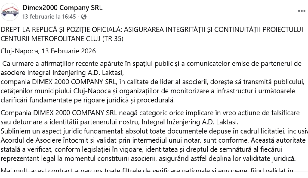 La mai bine de zece zile de la izbucnirea scandalului privind asocierea pentru realizarea Centurii Metropolitane Cluj, compania bistrițeană DIMEX 2000 COMPANY SRL și-a făcut publică poziția într-un prim comunicat de presă oficial, postat pe pagina de facebook în care respinge acuzațiile apărute în spațiul public legate de licitația pentru Centura Metropolitană a Clujului.