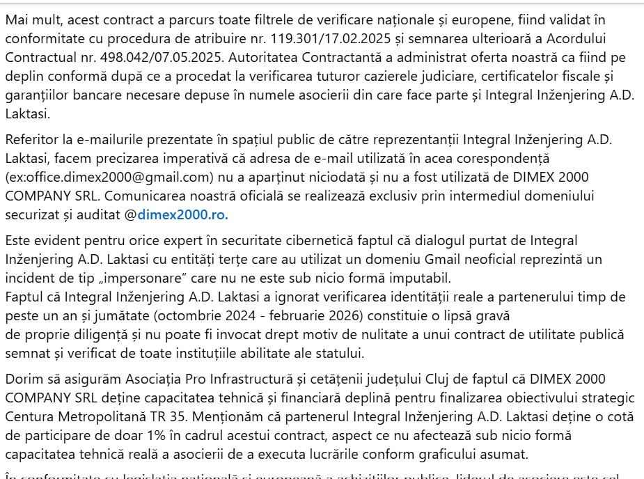 De asemenea, DIMEX precizează că partenerul bosniac deține o cotă de 1% în cadrul contractului și că litigiul invocat nu afectează capacitatea tehnică și financiară a proiectului. În plus Dimex se consideră victimă a unei campanii de dezinfomare, împotiva căreia susține că va acționa în instanță.