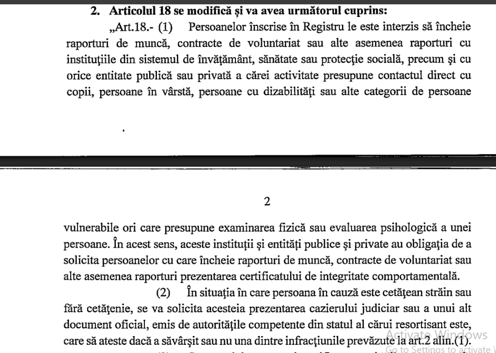 Potrivit textului adoptat de Camera Deputaților, persoanelor înscrise în Registrul automat naționalizat le este interzis să încheie ”raporturi de muncă, contracte de voluntariat sau alte asemenea raporturi cu entitățile publice sau private din sistemul de învățământ, sănătate, protecție socială, educație fizică și sport, precum și cu orice entitate publică sau privată a cărei activitate presupune contactul direct cu copii, persoane în vârstă, persoane cu dizabilități sau alte categorii de persoane vulnerabile ori care presupune examinarea fizică sau evaluarea psihologică a unei persoane”.