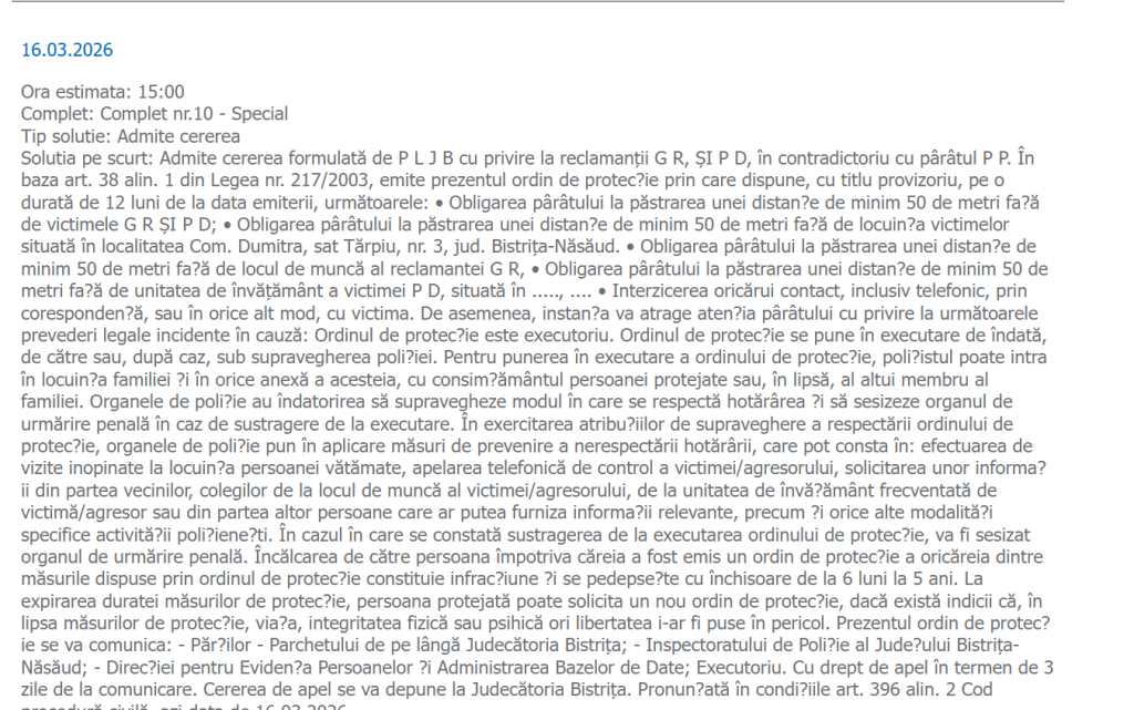 Un localnic din Viișoara de 47 de ani, cu ordin de protecție de la judecători pentru un an întreg și interdicție de a se apropia de fosta soție și fiica lor minoră l-a încălcat de mai multe ori de îndată ce a fost emis. Polițiștii l-au reținut vineri după ce a bombardat-o cu mesaje pe fosta sa parteneră de viață iar duminică, 22 martie, individul, a ajuns în fața judecătorilor din completul de urgență al Judecătoriei Bistrița cu propunere de arestare preventivă.