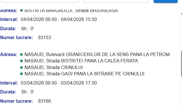 În Năsăud primul segment de locuințe și firme au rămas fără electricitate, din cauza lucrărilor de instalare a stâlpilor în intervalul 9-17: este vorba de Bulevardul Grănicerilor (de la Cofetăria Polaris până la intersecția cu str. Bistriței. Al doilea tronson care va intra în lucru va afecta, tot astăzi, 1 aprilie, între orele 12-17 străzile Crinului Trandafirului.
