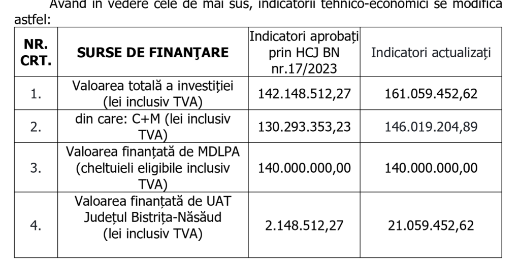 Potrivit documentației aprobate astăzi prin votul tuturor consilierilor prezenți, consultată de Bistrița Express, cea mai mare parte a majorării provine din lucrări suplimentare și creșteri de costuri, estimate la 19,9 milioane de lei, care acoperă aproape integral creșterea contractului. Majorarea cotei de TVA de la 19% la 21% din 2025 invocată în nota de fundamentare are un impact redus în întreaga sumă (abia 330 de mii de lei).