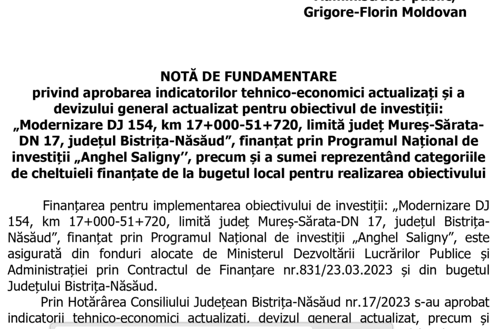 Potrivit notei de fundamentare, atașată proiectului de hotărâre, finanțarea DJ 154 prin Programul Național de Investiții Anghel Saligny rămâne plafonată la 140 de milioane de lei, ceea ce înseamnă că diferența rezultată din majorare va fi suportată din bugetul județului. Astfel, contribuția Consiliului Județean crește de la aproximativ 2,1 milioane de lei la peste 21 de milioane de lei, la care se adaugă obligațiile de cofinanțare pentru decontările din 2026.
