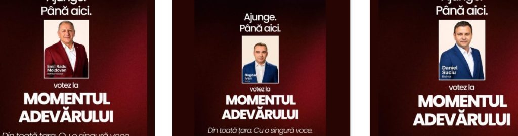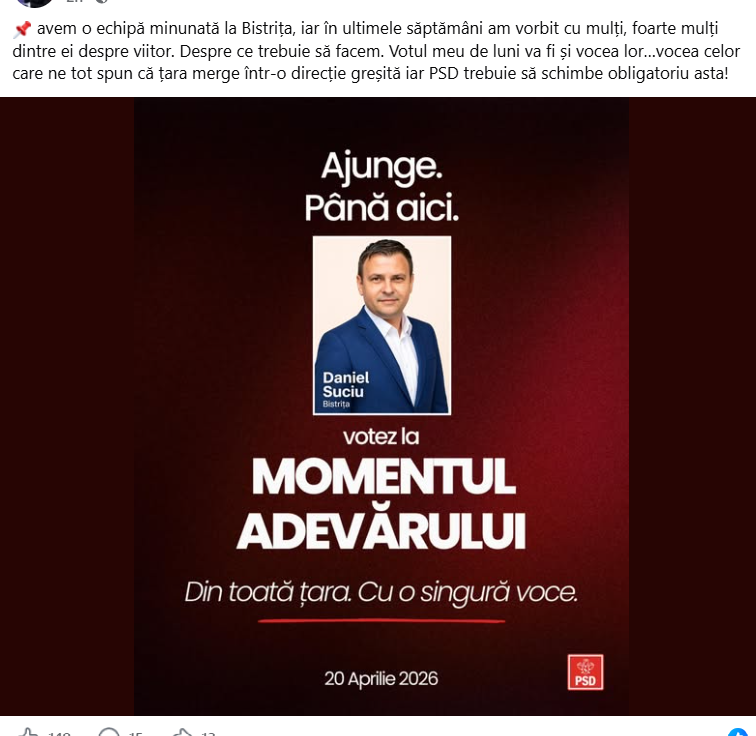 Liderii PSD Bistrița-Năsăud: Radu Moldovan, ministrul Bogdan Ivan, deputatul Daniel Suciu, au afișat astăzi pe facebook cartoline cu mesaje identice care fac trimitere refuzul de a-l mai accepta pe liberalul Ilie Bolojan în fruntea Guvernului. Cartolinele cu același vizual, pe care este aplicată fotografia titularului au mesajul: ”Ajunge. Până aici” și ”Votez la momentul adevărului. Din toată țara. Cu o singur voce”, cu trimitere la referendumul intern din PSD în care li se cere membrilor să voteze daca îl mai vor sau nu pe Ilie Bolojan premier și care se încheie luni, 20 aprilie.