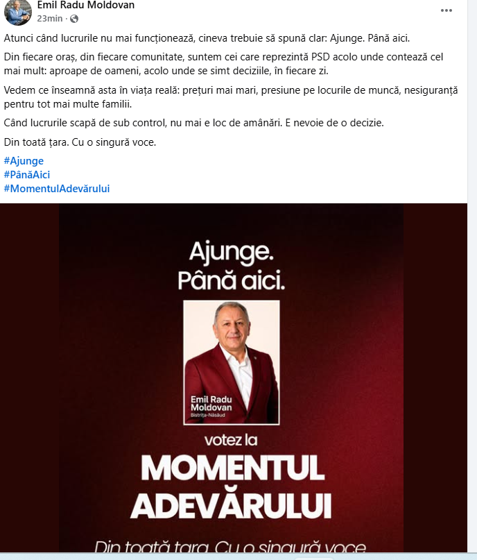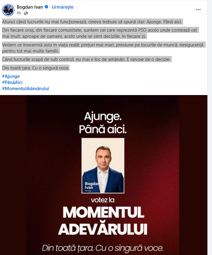 Atunci când lucrurile nu mai funcționează, cineva trebuie să spună clar: Ajunge. Până aici. Din fiecare oraș, din fiecare comunitate, suntem cei care reprezintă PSD acolo unde contează cel mai mult: aproape de oameni, acolo unde se simt deciziile, în fiecare zi. Vedem ce înseamnă asta în viața reală: prețuri mai mari, presiune pe locurile de muncă, nesiguranță pentru tot mai multe familii. Când lucrurile scapă de sub control, nu mai e loc de amânări. E nevoie de o decizie. Din toată țara. Cu o singură voce.” este textul cu care ministrul Energiei, Bogdan Ivan și președintele PSD BN, Radu Moldovan au însoțit postarea.