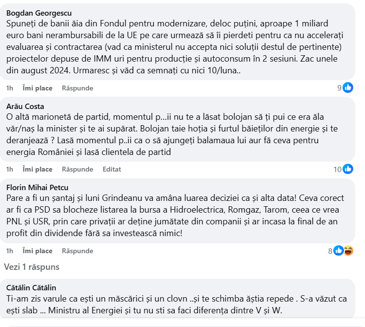 Un altul îl întreabă pe ministrul Energiei dacă postarea nu e cumva un autodenunț, amintindu-i că e membrul Guvernului, acuzat ca a scapat lucrurile de sub control: