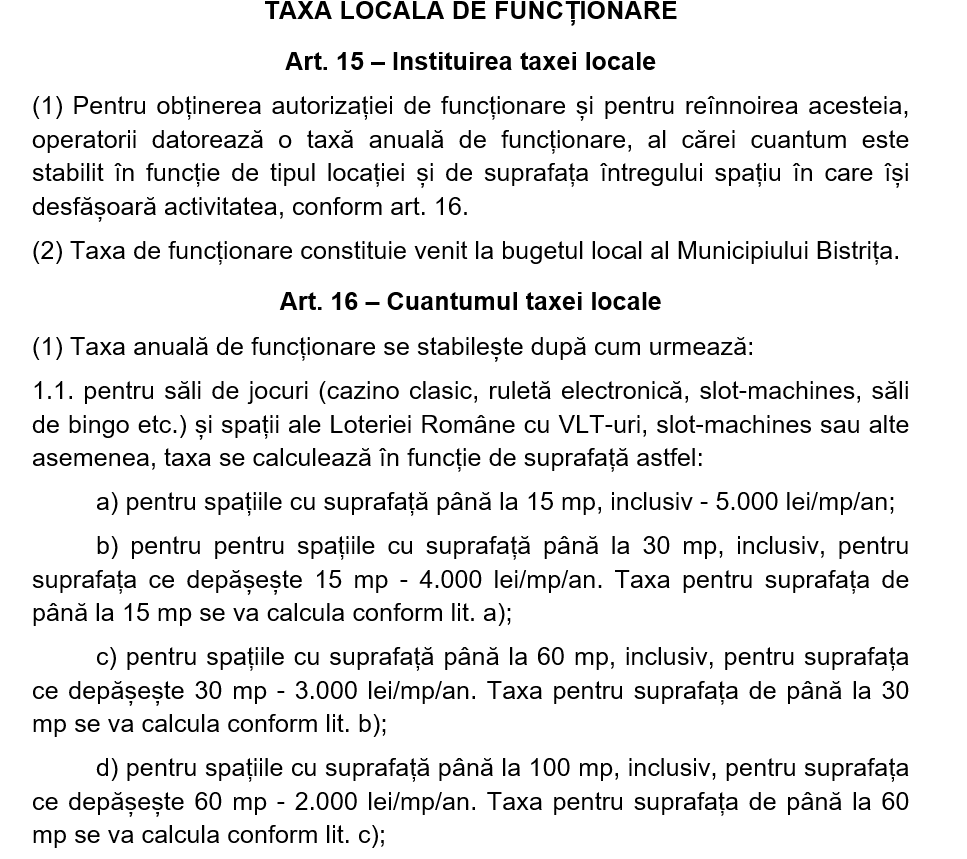 Proiectul care stabilește regulamentul de desfășurarea a jocurilor de noroc pe teritoriul Bistriței introduce taxare anuală specială pentru asemenea locații în funcție de metrul pătrat și restricții legate de locație ( vecinătatea școlilor) și interdicții legate de elemente vizuale ale sediilor.