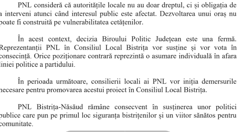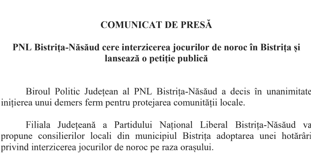 Sâmbătă PNL Bistrița-Năsăud le-a cerut consilierilor săi sa nu voteze proiectul de hotărâre în forma inițiată de primarul Gabriel Lazany și să promoveze o inițiativă de a interzice activitatea sălilor de jocuri de noroc pe teritoriul Bistriței:
