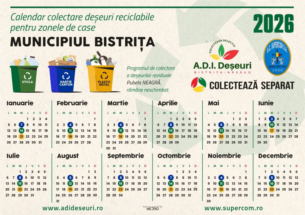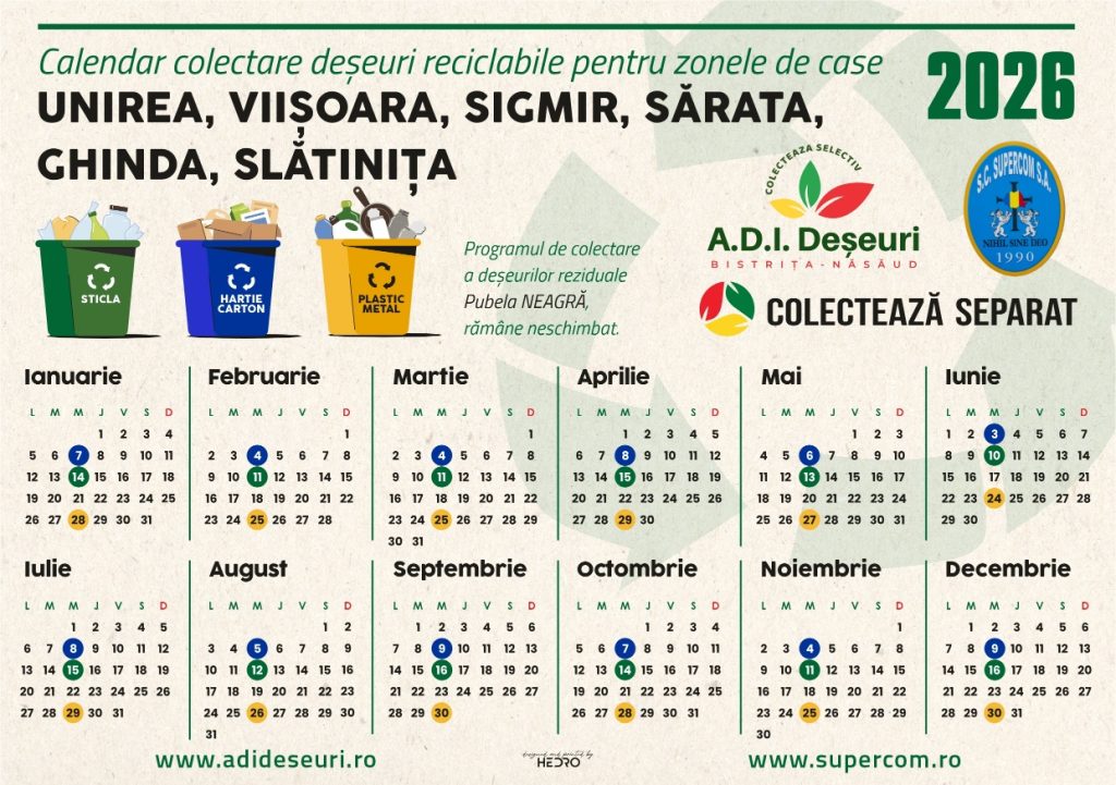 ADI Deșeuri Bistrița-Năsăud a anunțat programul de colectare a deșeurilor reciclabile pentru luna mai 2026 în municipiul Bistrița și în localitățile componente (Unirea, Viișoara, Sărata, Sigmir, Ghinda, Slătinița).
